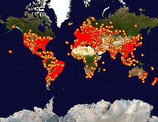 Well after I have lat/long, I need to convert them into xy coordinate of my world map. I got the world map from Wikimedia here. I chose the 310px version. From there a simple read of Mercator Projection will tell you what you need to know on how to do the conversion.