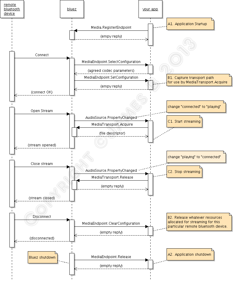 A1. Application Startup. Upon starting up, you need to tell bluez that your app will handle A2DP Sink or Sources for it. You do it by calling org.bluez.Media.RegisterEvent with the appropriate parameters, mainly UUID, Codec, and Capabilities.