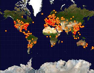 This page describes a similar independent implementation - except that the dots depict where each of the website visit (aka stats, or "hits"), like this: